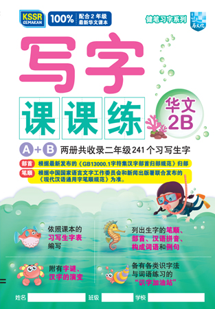 《写字课课练》分为 A、B两册,是配合《二年级华文课本》的指定生字编写,并且列出有关生字的笔顺和部首。为了加强学生对有关生字的认识和印象,我们也同时列出有关生字的汉语拼音、构成词语和例句,附加字谜和汉字的演变。另外,我们在精心设计的识字加油站里穿插各类识字法与词语练习,有助于学生掌握认字和写字的技能。